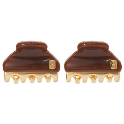 Мастера марки выполнили миниатюрные заколки оттенка латте из легкого прочного ацетата, который не царапается и долго не теряет глянцевый блеск. Изделия плотно фиксируют локоны благодаря фирменному пружинному зажиму. Каждый из двух аксессуаров, вошедших в комплект, декорировали золотистой эмблемой бренда.