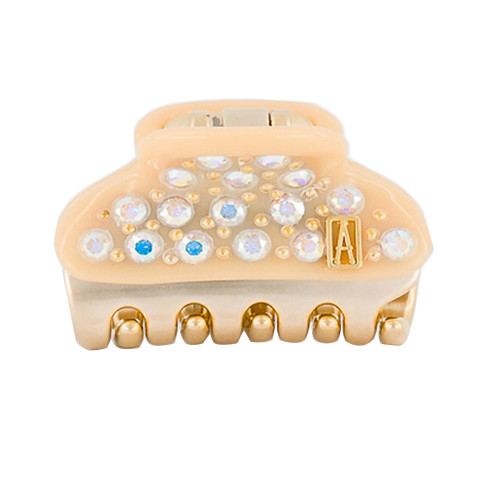 Небольшая заколка-краб буквально оживает на свету от блеска кристаллов Swarovski и золотистых полубусин. Мастера марки закрепили элементы так близко друг к другу, что издали они кажутся единым сверкающим полотном. Яркие блики скользят не только по декору, но и по коричневой основе из глянцевого ацетата.